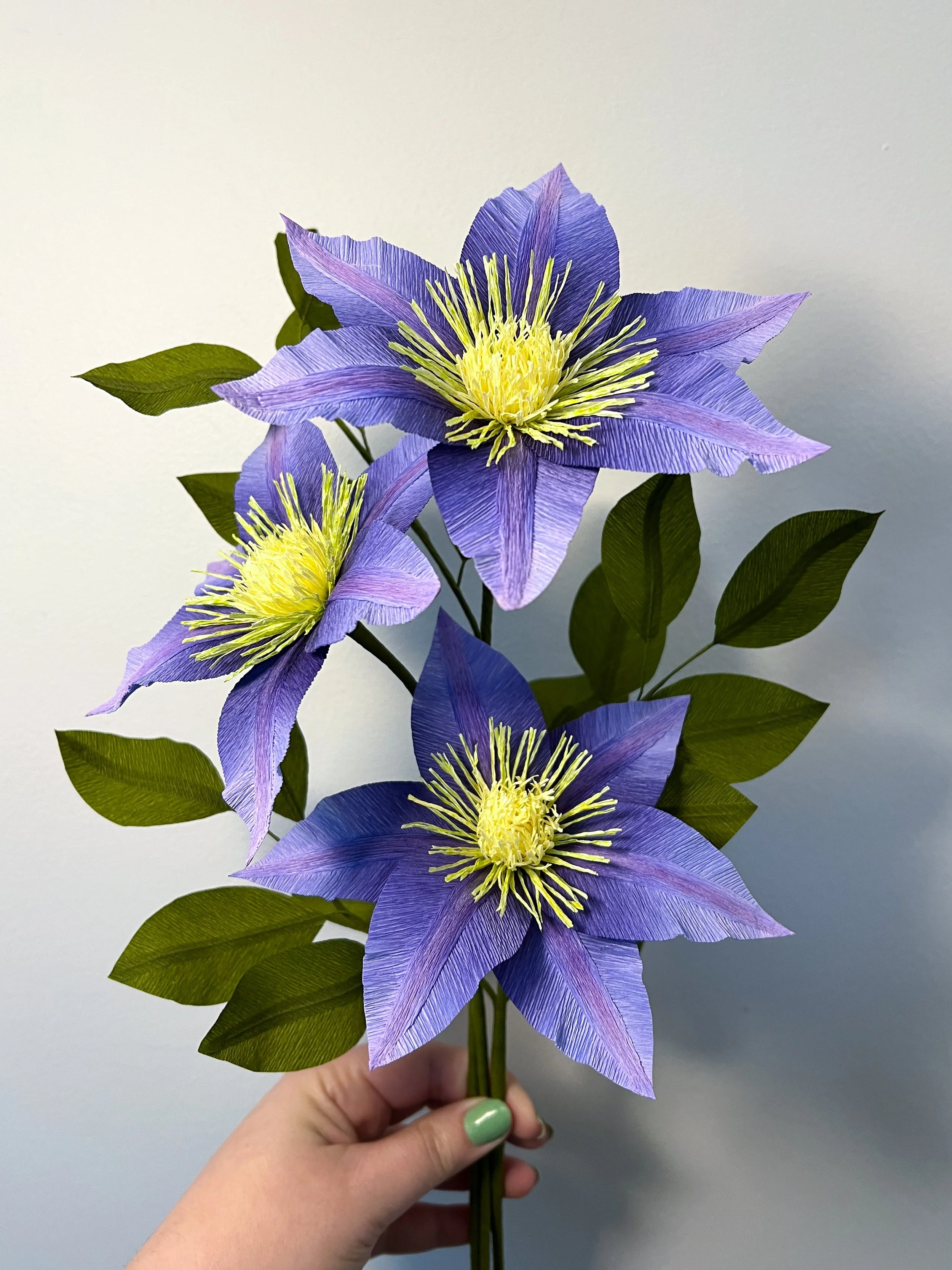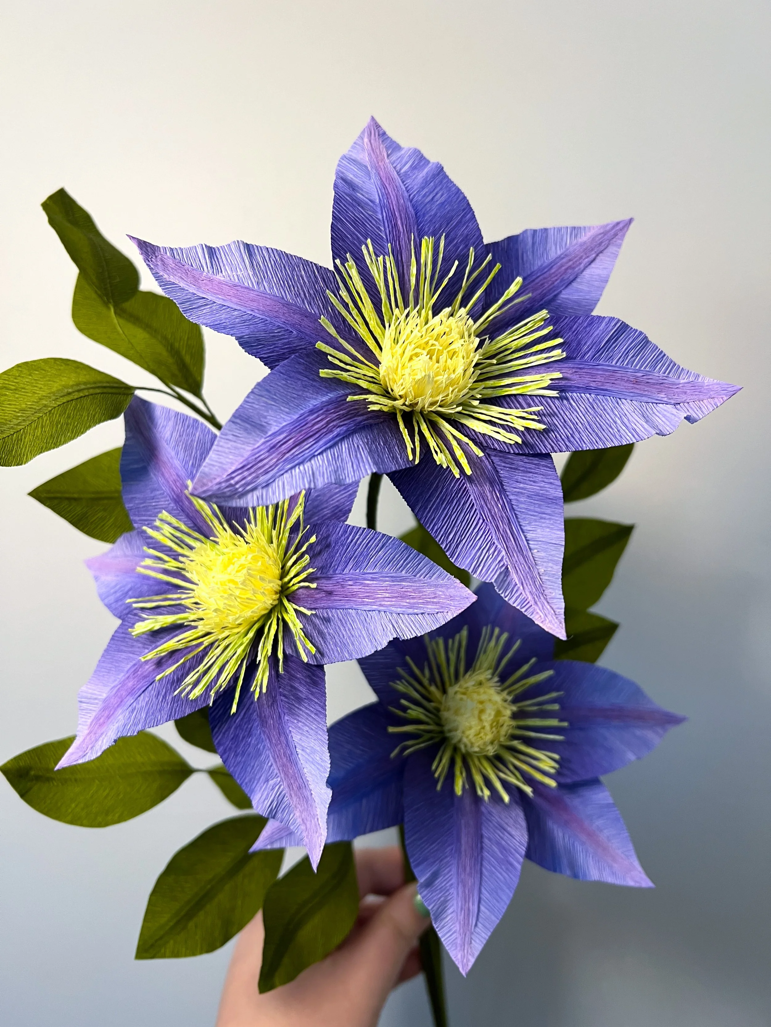 3 purple Clematis with vining leaves.